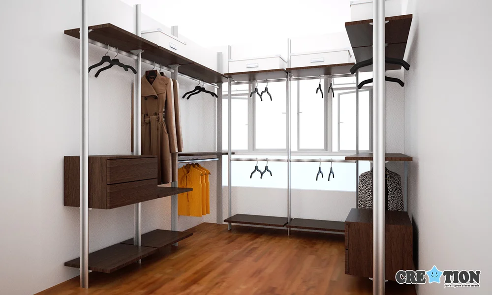 You can choose three drawers that hang on the poles or a four or five drawer units on castors. The corners are more accessible and shelves can be mounted at any height, even up to the ceiling, to easily hold all the boxes for changes in seasons. Children will grow up and their needs and requirements for the wardrobe will vary. Abode wardrobe walk in wardrobe organisers or systems. It is manufactured by four winds in changhua. Pole system wardrobe fixtures are movable and interchangable, with different designs and colours, advised by professional designers. Walk in wardrobes, luxurious dressing rooms, and custom closet systems. If you'd like to have an island in the middle, you would require a minimum width of 3 m to do so. The luxury of space is what most singaporeans yearn for but are short off. All shelving is 25mm thick melamine with pvc and aluminium edging that. Giving you a grand entrance with our optical glass sliding doors. Our pole system wardrobe is a modular storage system of a high quality, yet a very economical option for your walk in wardrobe. Creation singapore is a leading manufacturer for customized closet, pole system & walk in wardrobe.