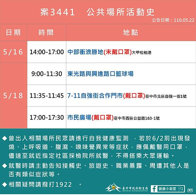 è¨æ¯ å°ä¸ç¢ºè¨ºåæ¡è¶³è·¡å°å from www.health.taichung.gov.tw Jun 02, 2021 · 台中市今(2)日新增3例本土確診個案,分別為北屯區家庭群聚感染案相關個案8988北屯區63歲筍農、案8989北屯區34歲廣告公司員工、案9404的24歲美睫美甲. May 23, 2021 · 中央流行疫情指揮中心今(23)日再公布台中5例本土確診個案,分別為案4004的62歲男性退休人員、案4005的某校18歲高三女學生、案4006的66歲男性、案. May 30, 2021 · 台中公布最新確診者足跡 薔薇派豐原總店上榜. Jun 24, 2021 · 台中市今天未新增本土確診個案,但南投縣昨天公布1名確診男子,經疫調曾到台中4家旅館投宿,台中市政府已要求旅宿業者停業消毒,並匡列相關. May 19, 2021 · 另名確診者2353案為大里70歲女性,曾到台北龍山寺買衣服,再搭國光號回台中,15日發燒,17日確診;至於霧峰朝陽科大女學生正在疫調,目前還未. Jun 01, 2021 · 台中龍泉市場傳確診者足跡,今天下午經發局即派員現場消毒。 (記者何宗翰攝) 不用抽 不用搶 現在用app看新聞 保證天天中獎 點我下載app 按我看.
